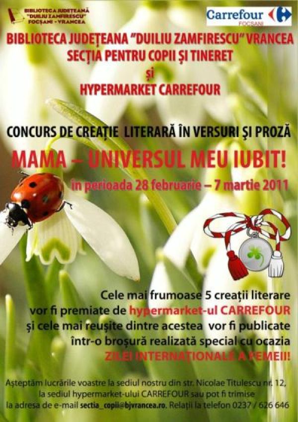 Secţia pentru Copii şi Tineret a Bibliotecii Judeţene ”Duiliu Zamfirescu” Vrancea şi Hypermarket-ul Carrefour, în perioada 28 februarie – 7 martie, lansează Concursul de creaţie literară în versuri şi proză – MAMA – UNIVERSUL MEU IUBIT! Premierea va avea loc vineri, 11 martie 2011, în cadrul unui eveniment găzduit de Hypermarket-ul Carrefour unde cele mai […]