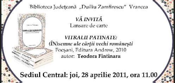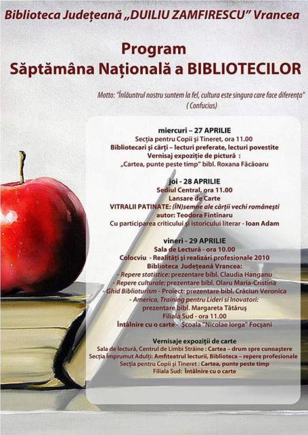 * Biblioteca Judeţeană „DUILIU ZAMFIRESCU” Vrancea, marchează şi în acest an Săptămâna Naţională a Bibliotecilor, ce va avea loc în perioada 23 – 30 aprilie, printr-un program ce va reuni bibliotecari, scriitori, cititori şi colaboratori * „Având ca motto: “Înlăuntrul nostru suntem la fel, cultura este singura care face diferenţa” (Confucius), bibliotecarii vor încerca să […]