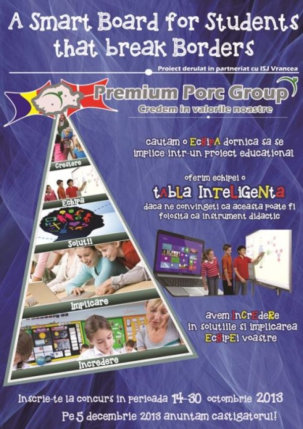 Premium Porc Group continuă tradiţia proiectelor născute în Vrancea, pentru Vrancea şi anunţă că lansează, în parteneriat cu ISJ Vrancea, în data de 14 octombrie 2013, concursul de proiecte şcolare ”A smart board for students that break borders”. În 2013 Premium Porc a investit în acţiuni şi evenimente dedicate educaţiei, sănătăţii şi protecţiei mediului, deoarece […]