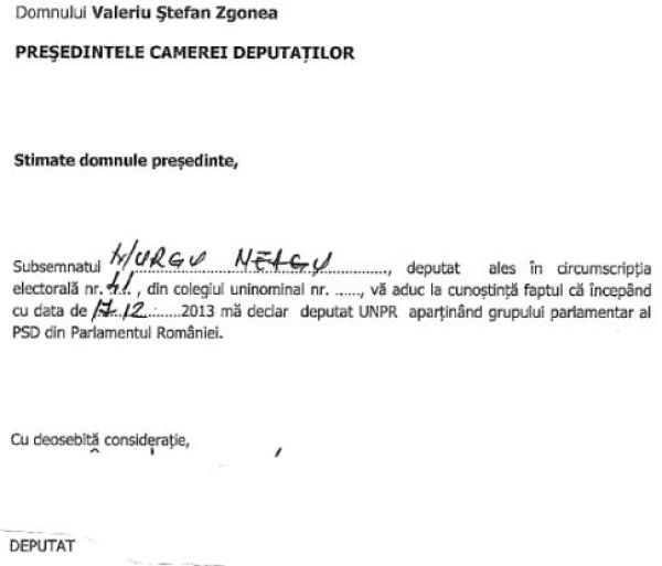 UNPR a trimis azi dimineată o copie a declarației de aderare a lui Neagu Murgu la acest partid, prin care devine practic membru al grupului parlamentar al PSD la Camera Deputaților. Scandalul este departe de a se fi stins deoarece respectivul document, deși este scanat, nu are semnătura deputatului Neagu Murgu în clar. Vă prezentăm […]