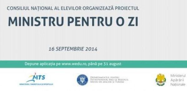 Consiliul Naţional al Elevilor, organizează, în data de 16 septembrie, proiectul „Ministru pentru o zi”, împreună cu Ministerul Educaţiei Naţionale, Ministerul Tineretului şi Sportului, Ministerul Apărării Naționale și Departamentul pentru Întreprinderi Mici și Mijlocii, Mediul de afaceri și Turism. Scopul programului îl reprezintă conştientizarea responsabilităţilor unui lider cu atribuţii la nivel naţional și înlăturarea barierelor […]