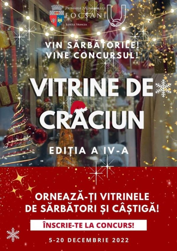 * Primăria Focșani lansează cea de-a IV-a ediție a concursului public “Vitrine de Crăciun”, privind pavoazarea cu ornamente luminoase de sărbători a vitrinelor și a spațiilor din incintele firmelor * Concursul se va derula în perioada 20 decembrie 2022 – 24 ianuarie 2023 * Câștigătorul va primi suma de 5000 lei; locul II – suma […]