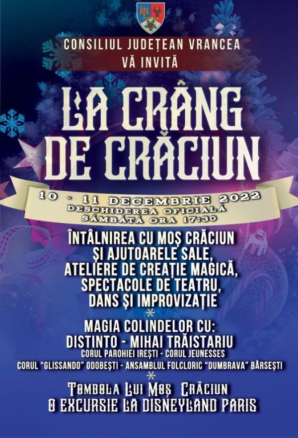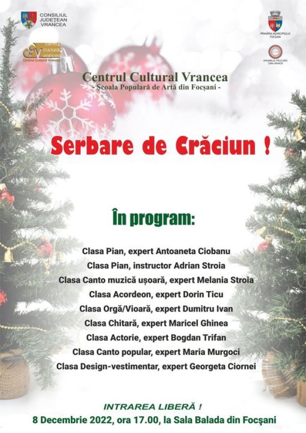 Consiliul Judeţean Vrancea, prin Centrul Cultural Vrancea în parteneriat cu Ansamblul Folcloric Țara Vrancei, organizează joi, 8 decembrie 2022, la sala Balada din Focșani, ora 17.00, un spectacol dedicat sărbătorilor de iarnă. Cursanții și experții Școlii Populare de Artă, de la clasele Pian, Acordeon, Chitară, Orgă, Vioară, Canto popular, Canto muzică ușoară, Design-vestimentar și Actorie […]