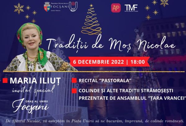 Pe 6 decembrie 2022, de Sfântul Nicolae, Primăria Municipiului Focșani, prin instituțiile de cultură din subordine, organizează un recital de colinde, susținut de Corul ”Pastorala”, dar și un concert folcloric oferit de artiștii Ansamblului Folcloric ”Țara Vrancei”. Invitat special al evenimentului este artista Maria Iliuț, din Chișinău. Fie că ați fost cuminți și ați primit […]