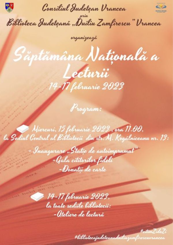 Consiliul Județean Vrancea, prin Biblioteca Județeană „Duiliu Zamfirescu” Vrancea organizează timp de patru zile (14-17 februarie), mai multe activități dedicate Zilei Naționale a Lecturii. Miercuri, 15 februarie, de la ora 11.00, va avea loc lansarea unui nou serviciu de bibliotecă bazat pe tehnologie modernă: Stația de autoîmprumut, la Sediul Central din Str. Mihail Kogălniceanu nr. […]