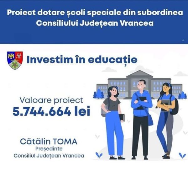 A fost admis și declarat eligibil proiectul „Dotarea școlilor speciale din subordinea Consiliului Județean Vrancea, a cabinetelor de asistență psihopedagogică din cadrul CJRAE și a Palatului Copiilor cu mobilier, materiale didactice și echipamente digitale”, depus spre finanțare prin Programul Național de Redresare și Reziliență (PNRR). Beneficiarii proiectului sunt: Centrul Şcolar pentru Educaţie Incluzivă „Elena Doamna”; […]