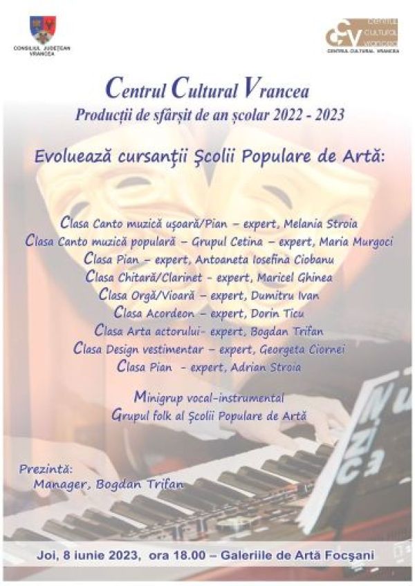 Centrul Cultural Vrancea, organizează în perioada 8 iunie – 14 iunie 2023, un amplu program artistic al Școlii Populare de Artă, dedicat sfârșitului de an școlar. Manifestările artistice ale Centrului Cultural Vrancea vor debuta la Galeriile de Artă Focșani: – joi, 8 iunie 2023 – Producții de sfârșit de an școlar – serbare a elevilor […]