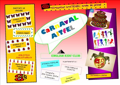 * „Carnavalul Altfel” vă propune, miercuri 20 aprilie 2016, de la ora 16, la Sala Mare a Ateneului Popular Focșani, minute de interacțiune, tradiție, sport,versuri, muzică, dans și teatru, în română, franceză și engleză, cu participarea pe scenă a copiilor de la grădinițele Gugești, nr.11 Focșani, nr.16 Focșani, Biblioteca Publică Năruja, Centrul de Limba Franceză Focșani, Clubul de Engleză Focșani *