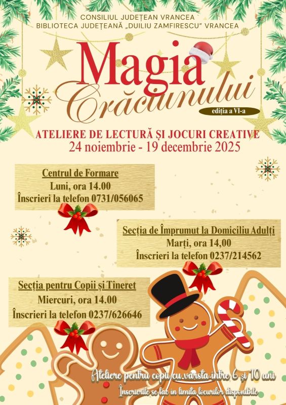 Consiliul Județean Vrancea, prin Biblioteca Județeană „Duiliu Zamfirescu” Vrancea, organizează în perioada 24 noiembrie – 19 decembrie 2025, ediția a VI-a a atelierelor de lectură și jocuri creative, „Magia Crăciunului”.