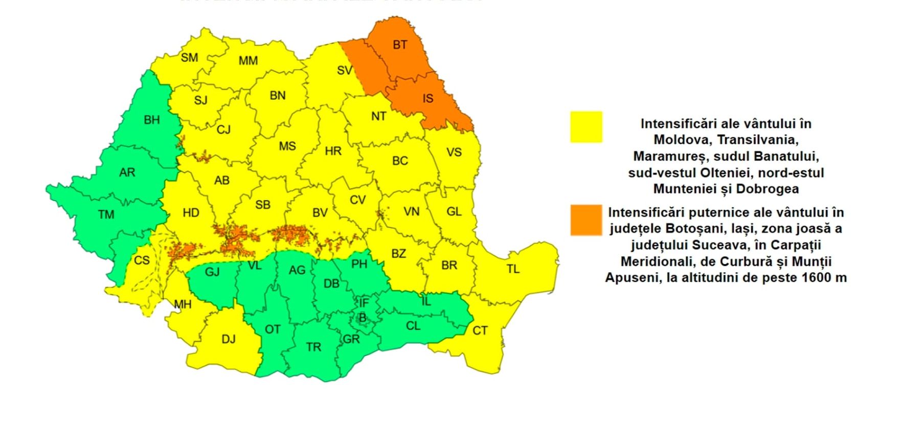 * Rafale extrem de puternice, de 90-130 km/h, se vor înregistra la altitudini de peste 1600 m în Carpații Meridionali, de Curbură și în Munții Apuseni.