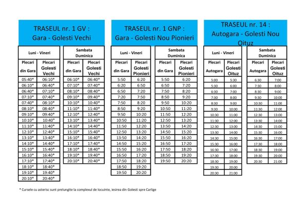 Începand cu 11.09.2023 se vor modifica graficele de circulatie pe traseele ce deservesc comuna Golesti : – traseul 1GNO : Gara – Golesti Nou Oituz se va suspenda. – graficele traseelor 1GNP : Gara – Golesti Nou Pionieri, 1GV : GARA – Golesti Vechi si 14 : Autogara – Golesti Nou Oituz sunt :