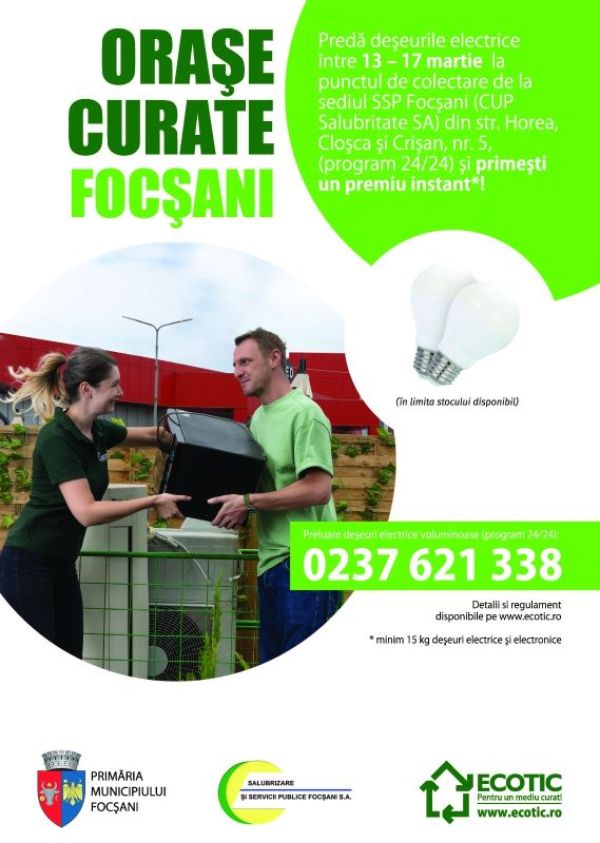 * Primăria Municipiului Focșani, în colaborare cu Salubrizare și Servicii Publice Focșani S.A. și ECOTIC desfășoară Campania „Orașe Curate – Focșani” cu scopul de a colecta deșeurile electrice, electronice și electrocasnice (DEEE) * Detalii cu privire la desfășurarea campaniei, precum și regulamentul ”Focșani-Oraș Curat!” sunt disponibile pe www.focșani.info, www.salubfocsani.ro și www.ecotic.ro * Astfel, în perioada […]