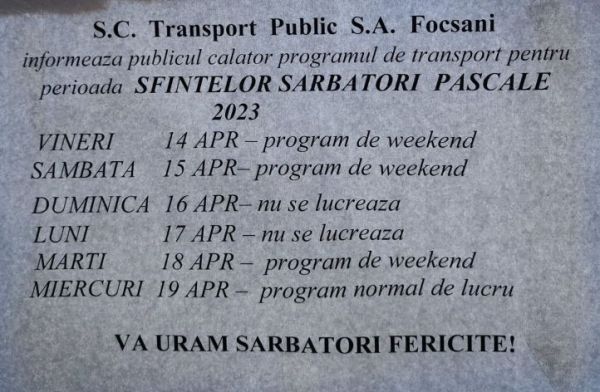 * TRANSPORT PUBLIC SA Focșani vă urează SĂRBĂTORI FERICITE și anunță faptul că programul de transport în municipiu este cel de mai jos * Astfel programul mijloacelor de circulație, ce efectuează transport public local de călători în Municipiul Focșani, Comuna Golești, Comuna Câmpineanca, Comuna Vârteșcoiu – sat Olteni, Comuna Milcovul, Comuna Gologanu, Comuna Răstoaca și […]
