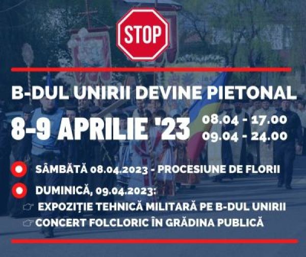 * În acest week-end, B-dul Unirii devine pietonal ca urmare a evenimentelor care vor avea loc în Piața Unirii și în Grădina Publică în perioada 8-9 aprilie 2023 * Sâmbătă, 8 aprilie 2023, B-dul Unirii va fi închis de la ora 17.00, pentru buna desfășurare a tradiționalei Procesiuni de Florii, organizată în Focșani de către […]