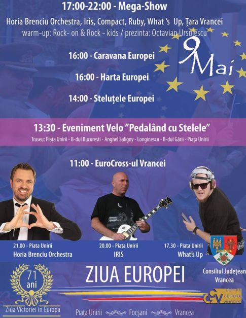 * Consiliul Județean Vrancea și Centrul Cultural Vrancea organizează în data de 9 Mai, începând cu orele 10.00, mai multe manifestări prilejuite de ”Ziua Europei” * La ora 11.00 va avea loc tradiționala competiție ”Eurocross-ul Vrancei”. Startul se va da la Mausoleul Eroilor din municipiul Focșani, premierea câștigătorilor urmând să aibă loc în Piața Unirii *
