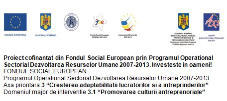Planul de afaceri a fost selectat in cadrul proiectului “Dezvoltarea Antreprenoriatului in Regiunile de Dezvoltare Sud-Est si Sud-Muntenia” – DARSESM, Axa Prioritara 3 “Cresterea adaptabilitatii lucratorilor si a intreprinderilor”, Domeniul Major de Interventie 3.1 “Promovarea culturii antreprenoriale”, ID proiect 149522, contract nr. POSDRU/176/3.1/S/149522.