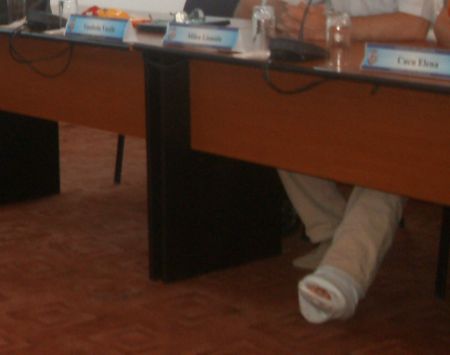 Unul dintre consilierii locali ai municipiului Focşani a venit cu piciorul în gips la şedinţa ordinară de joi după amiază convocată de primarul Decebal Bacinschi. Ajuns la şedinţă acesta nu a scăpat de întrebările colegilor consilieri care au vrut să ştie cum s-a procopsit cu aşa frumuseţe de gips, mai ales că mai toată lumea ştia că a fost plecat în vacanţă.