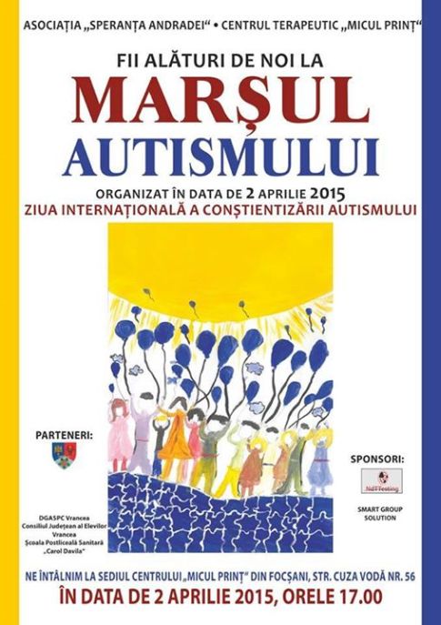 Pentru al cincilea an consecutiv, ca o acțiune de conștientizare a autismului, Asociația Speranța Andradei va organiza pe 2 aprilie, joi, la Focșani, ora 17:00, Marșul Autismului. Punctul final al acestui marș va fi reprezentat de un moment eliberare a unor baloane albastre către cer în fața Teatrului Municipal Maior Gheorghe Pastia, în mod simbolic. Locul de întâlnire este Centrul de zi “Micul Prinţ”, strada Cuza Vodă, nr. 56 (parcarea interioară). Totodată, seara de 2 aprilie va fi marcată prin iluminarea în albastru a uneia dintre cele mai importante clădiri din oraş – Teatrul Municipal “Maior Ghorghe Pastia”.