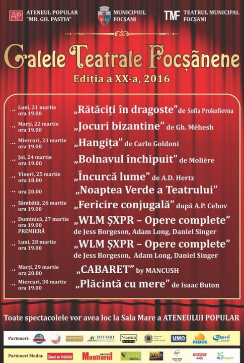 Ateneul Popular si Teatrul Municipal Focsani celebreaza pe 27 Martie Ziua Mondiala a Teatrului, prilej cu care organizează împreuna un maraton teatral, spre bucuria publicului focsanean.