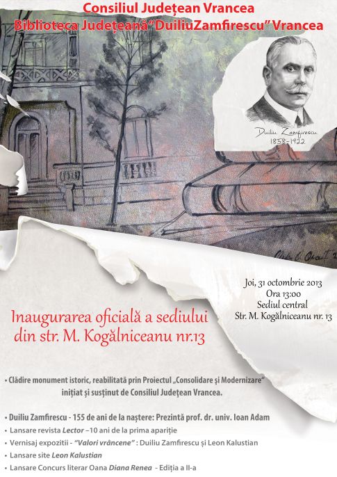 Joi, 31 octombrie 2013 ora 13.00, Biblioteca Județeană Vrancea va sărbători 155 de ani de la nașterea scriitorului Duiliu Zamfirescu. Cu această ocazie, Consiliul Judeţean Vrancea va inaugura noul sediu din strada M. Kogălniceanu nr. 13, care va adăposti peste 70 000 de volume din colecțiile secţiilor Împrumut la domiciliu, Periodice şi Carte veche din cadrul Bibliotecii Judeţene „Duiliu Zamfirescu” Vrancea.