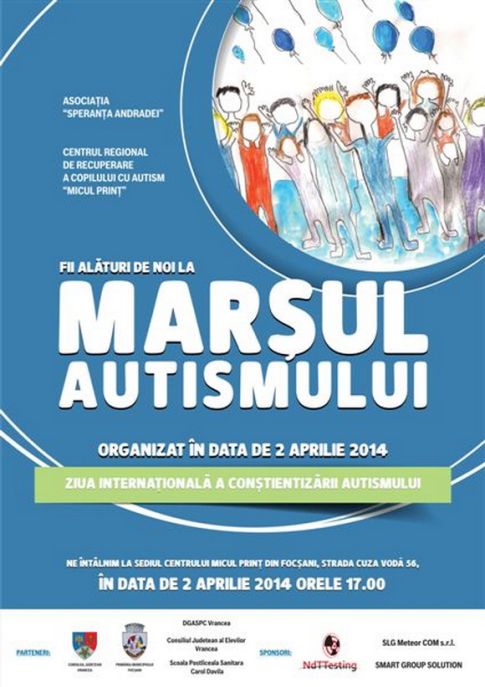 Asociația Speranța Andradei și centrul Regional de Recuperare a Copilului cu Autism „Micul Prinț“ vă invită miercuri, 2 aprilie 2014, la ora 17.00, pentru al patrulea an consecutiv, la Marşul Autismului. Locul de întâlnire este Centrul de zi “Micul Prinţ”, strada Cuza Vodă, nr. 56 (parcarea interioară).