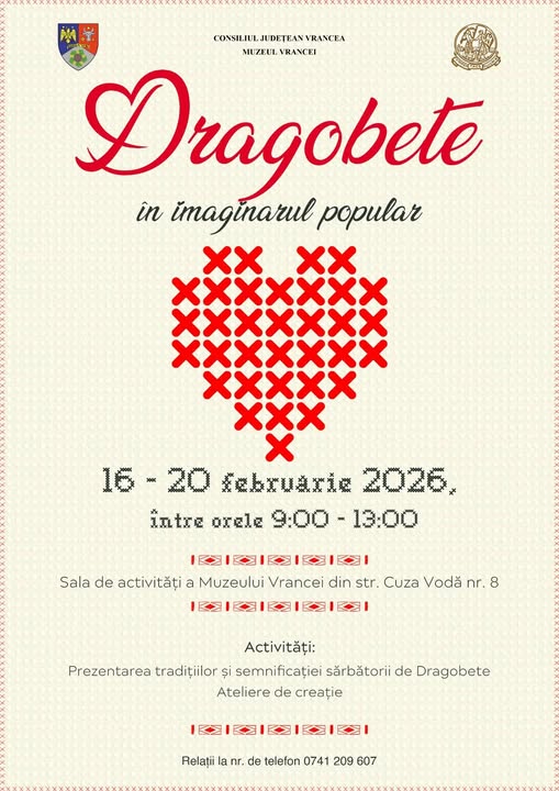 Consiliul Județean Vrancea, prin Muzeul Vrancei, organizează în perioada 16-20 februarie 2026, în sala de activități a Muzeului Vrancei din strada Cuza Vodă nr. 8, proiectul educațional „Dragobete în imaginarul popular“. Elevii vrânceni vor descoperi semnificația acestei sărbători, dar vor avea ocazia și să confecționeze obiecte cu specific popular, în cadrul atelierului creativ coordonat de specialiștii Secției de Etnografie.