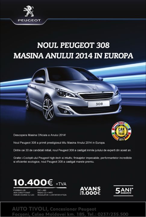 Noul PEUGEOT 308 este desemnat ”Car of the Year 2014”. Premiul a fost decernat de juriul alcătuit din jurnalisti din 22 tări europene, pe 3 Martie 2014, în cadrul celei de-a 84 editii a Salonului Auto de la Geneva, care si-a deschis portile înainte cu o zi pentru presa internatională de specialitate.