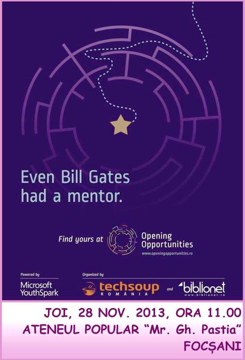 Joi, 28 noiembrie 2013, ora 11:00 la Ateneul Popular ”Mr.Gh.Pastia” Focșani are loc evenimentul de lansare al proiectului „Opening Opportunities”, proiect derulat de Biblioteca Judeţeană „Duiliu Zamfirescu” Vrancea împreună cu Biblionet și TechSoup România, cu sprijinul Microsoft România.