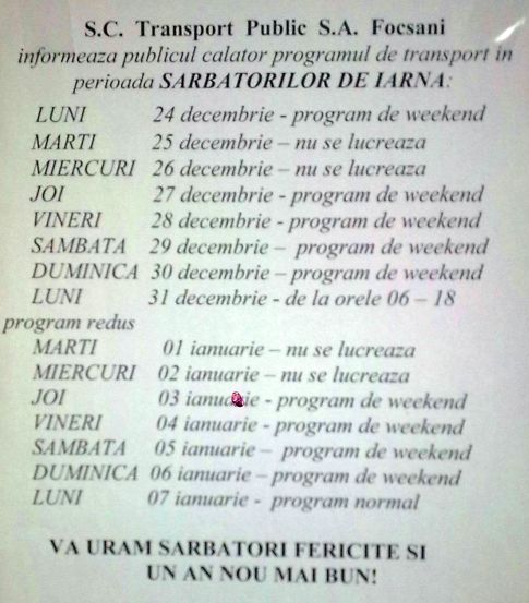 Programul de sărbători pentru transportul public de persoane în municipiul Focşani, asigurat de Transport Public SA, este următorul: