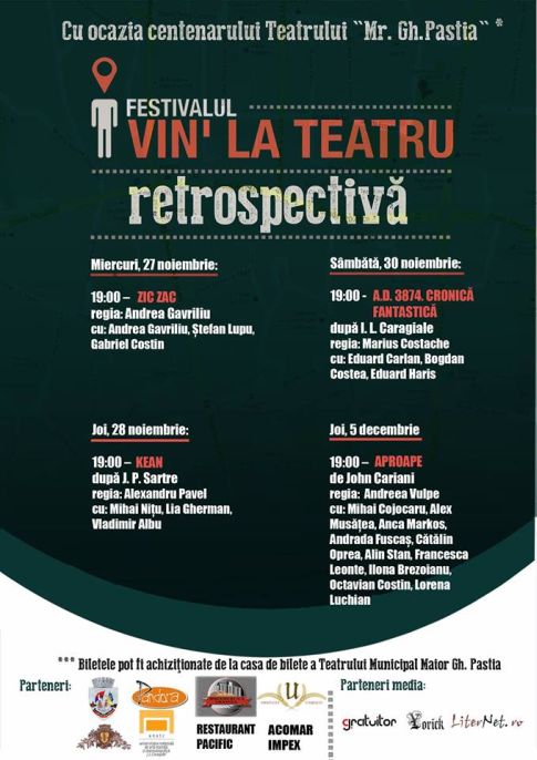 În perioada 27 noiembrie – 5 decembrie, în cadrul centenarului Teatrului Municipal „Maior. Gh. Pastia”, va avea loc retrospectiva primei ediții a Festivalului Vin’ La Teatru. Începând de miercuri, teatrul va găzdui trei dintre cele mai apreciate spectacole din selecția festivalului și un spectacol prezentat în premieră la Focșani. Toate cele patru spectacole vor începe la ora 19:00. Biletele pot fi procurate de la casa de bilete a teatrului. Mai multe detalii despre Ediția I găsiți pe site-ul festivalului: http://vinlateatru.ro/ și pe Facebook: https://www.facebook.com/vinlateatru