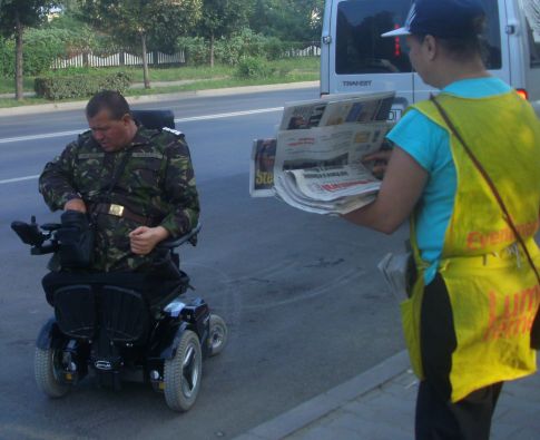 “Da, este prima mea zi de muncă”, ne-a spus Florinel Enache imediat după coborârea din maşină. Nu l-a ajutat nimeni pentru că nu a avut nevoie, Florinel Enache a mânuit foarte sigur şi precis comenzile căruciorului şi apoi a mers la vânzătoarea volantă din zonă şi a cumpărat ziarele de astăzi.