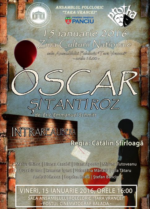 Cea mai premiată și apreciată trupă de teatru de elevi din județul Vrancea – ”Protha”, Panciu – va oferi spectatorilor din municipiul Focșani spectacolul ”Oscar și Tanti Roz”, de Eric-Emmanuel Schmitt cu ocazia Zilei Culturii Naționale – 15 ianuarie 2016.