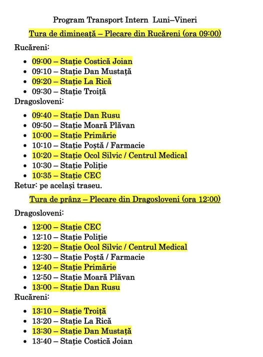 Primăria Soveja pune la dispoziție transport intern GRATUIT pe raza localității, proiectul demarând deja de pe 28 ianuarie. Prin acest serviciu, cetățenii vor putea ajunge mai ușor la Primărie, Centrul Medical, Poștă, CEC și alte puncte de interes din comună. Programul este valabil pentru săptămâna în curs, până vineri, urmând ca, în funcție de necesități și de feedbackul dumneavoastră, să fie ajustat sau extins cu noi rute. „Vă rugăm să ne transmiteți opiniile și sugestiile dumneavoastră pentru a îmbunătăți acest serviciu dedicat comunității“, transmite primarul comunei Soveja, Ionuț Filimon.